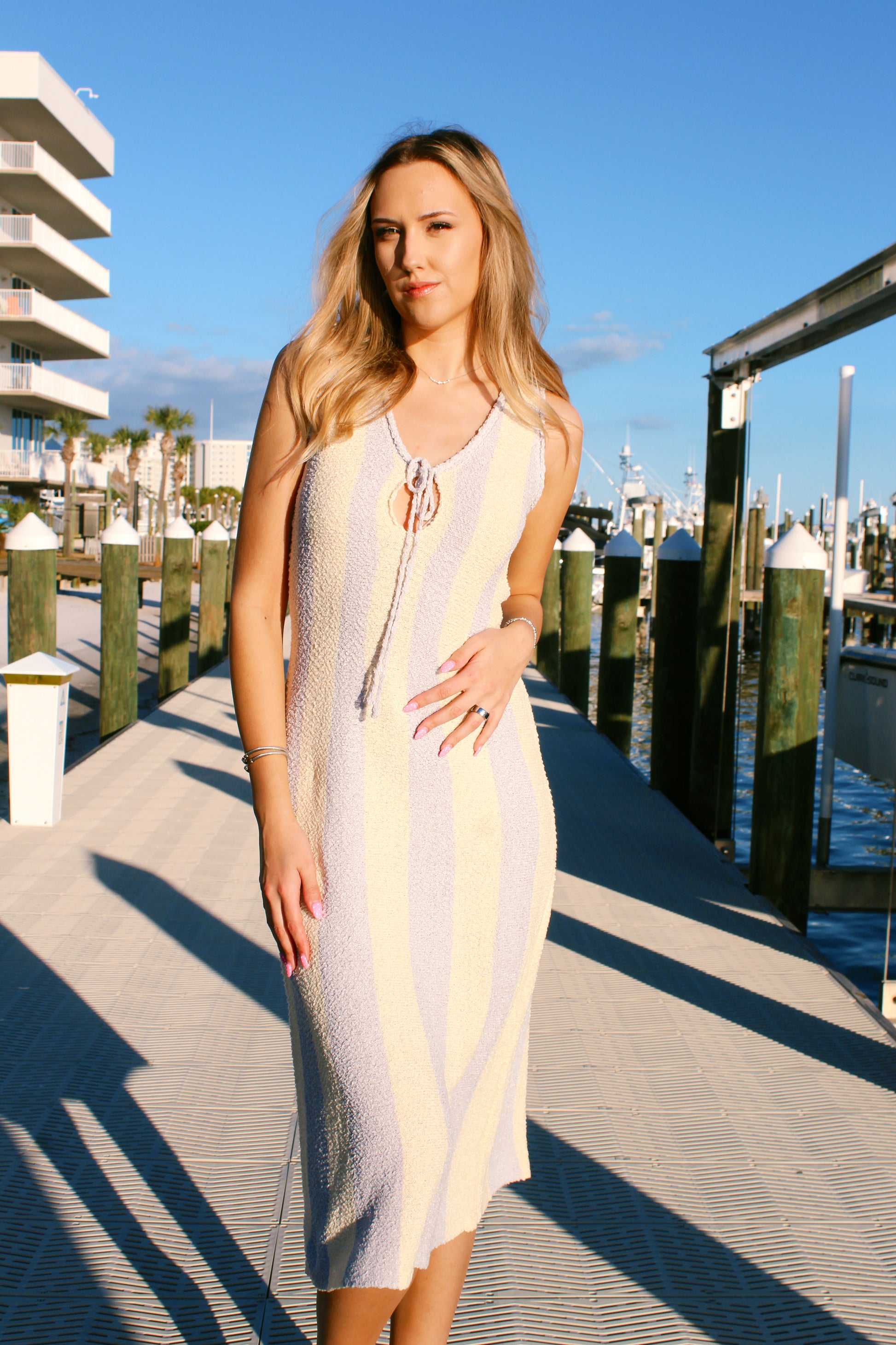 Soft, sunkissed, and effortlessly coastal — our Clearwater’s Dress is the perfect throw-on-and-glow summer staple. Designed in a dreamy textured knit with muted seaside stripes, this midi silhouette hugs in all the right places while still feeling breathable and easy to wear.