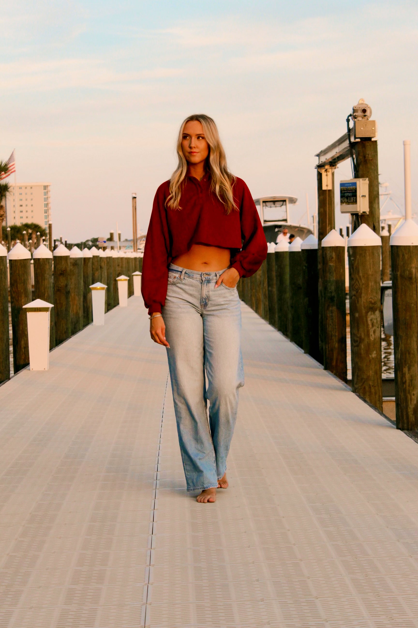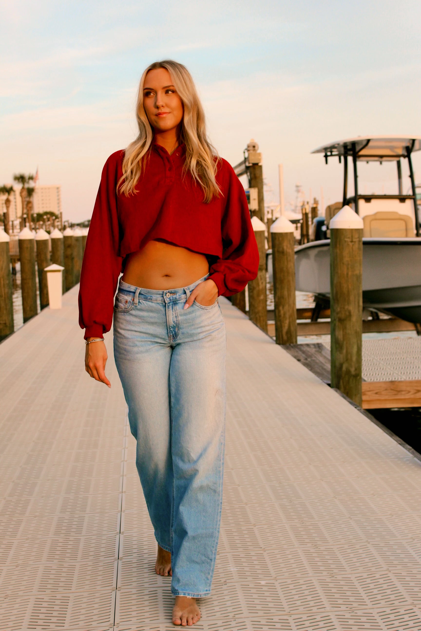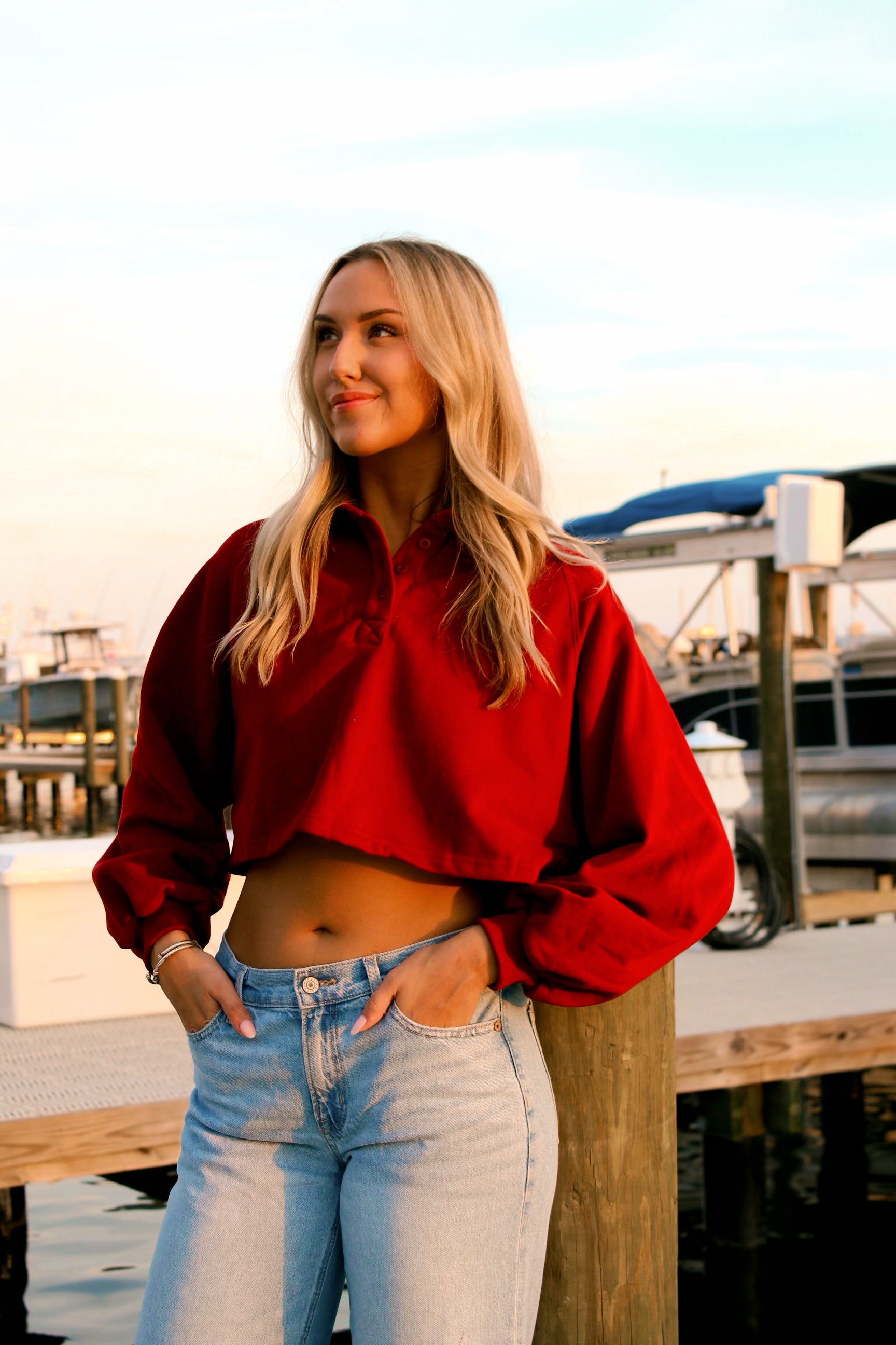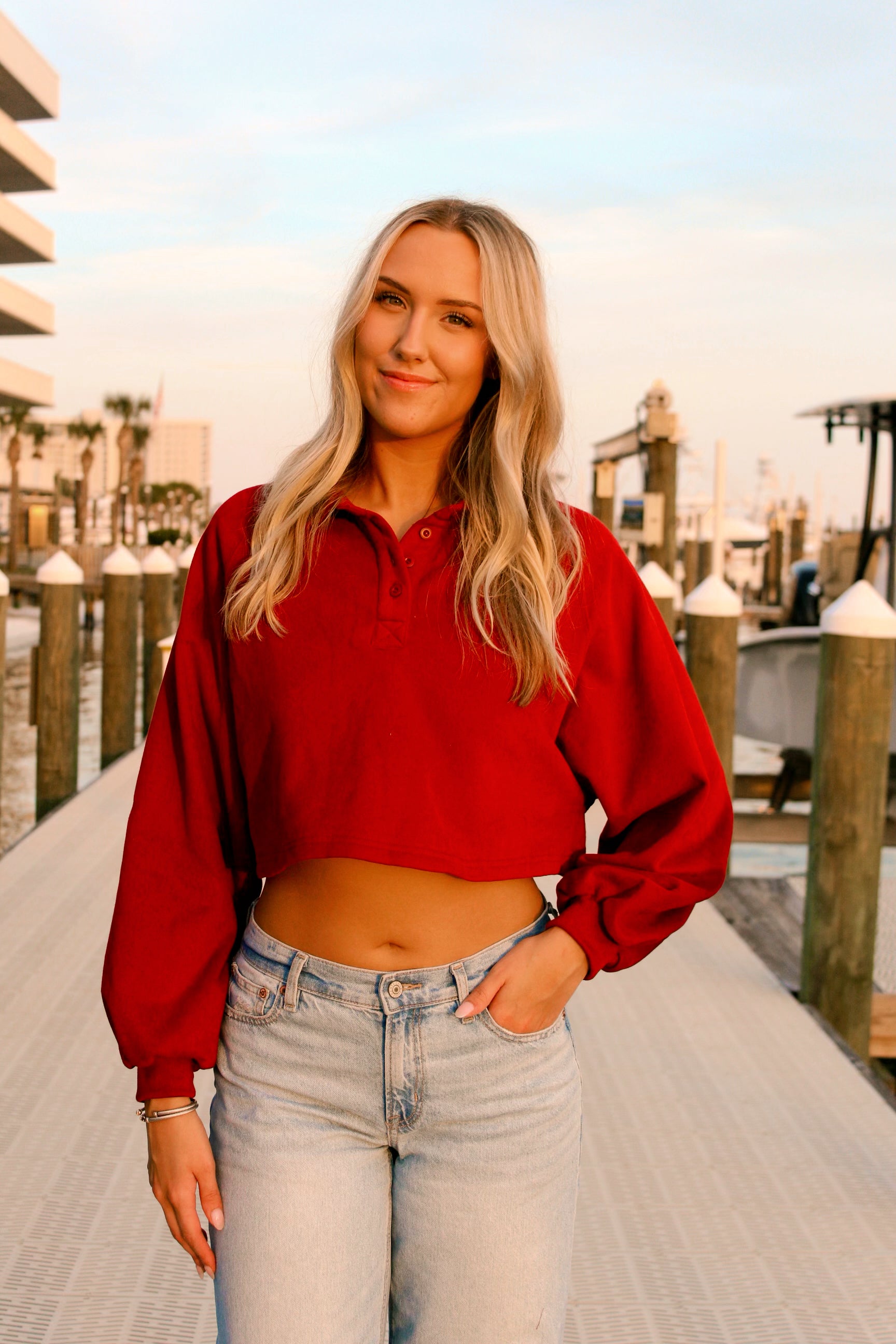 Effortlessly elevate your wardrobe with our dark cherry top. This long sleeve crop top features functional buttons and a super soft fabric for comfort. Don't be fooled by the photos, the longer length is perfect for all body types. Expertly designed for both fashion and function.