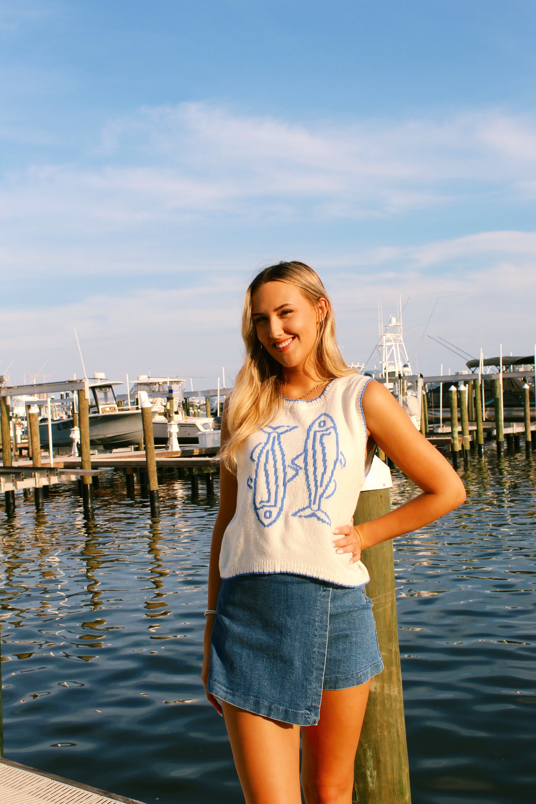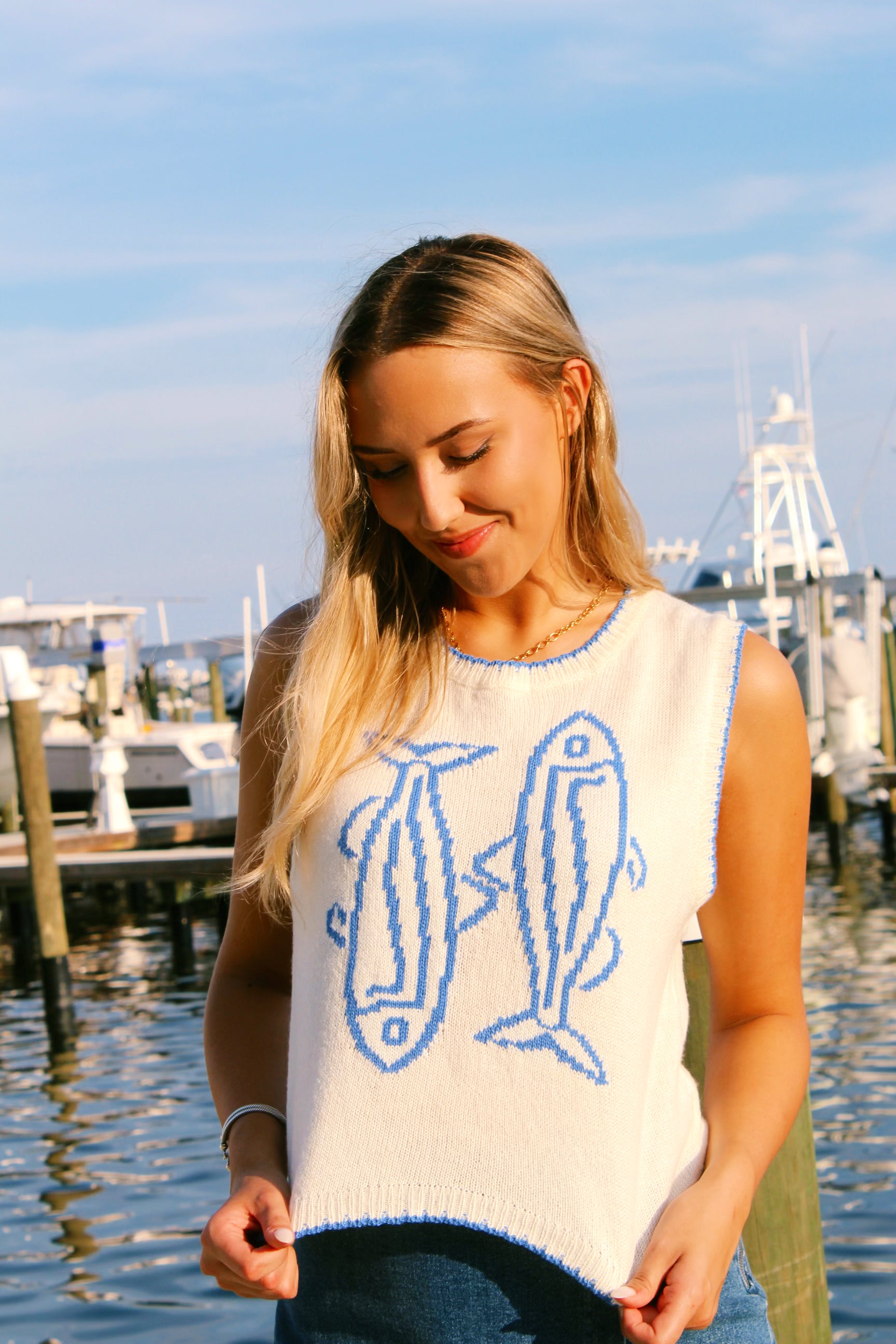 The Reel me in Sweater is the perfect coastal piece for both style and comfort. This lightweight sleeveless sweater is designed to fit true to size, making it a versatile addition to your wardrobe. It's great for any casual occasion and will keep you looking cute all day long.