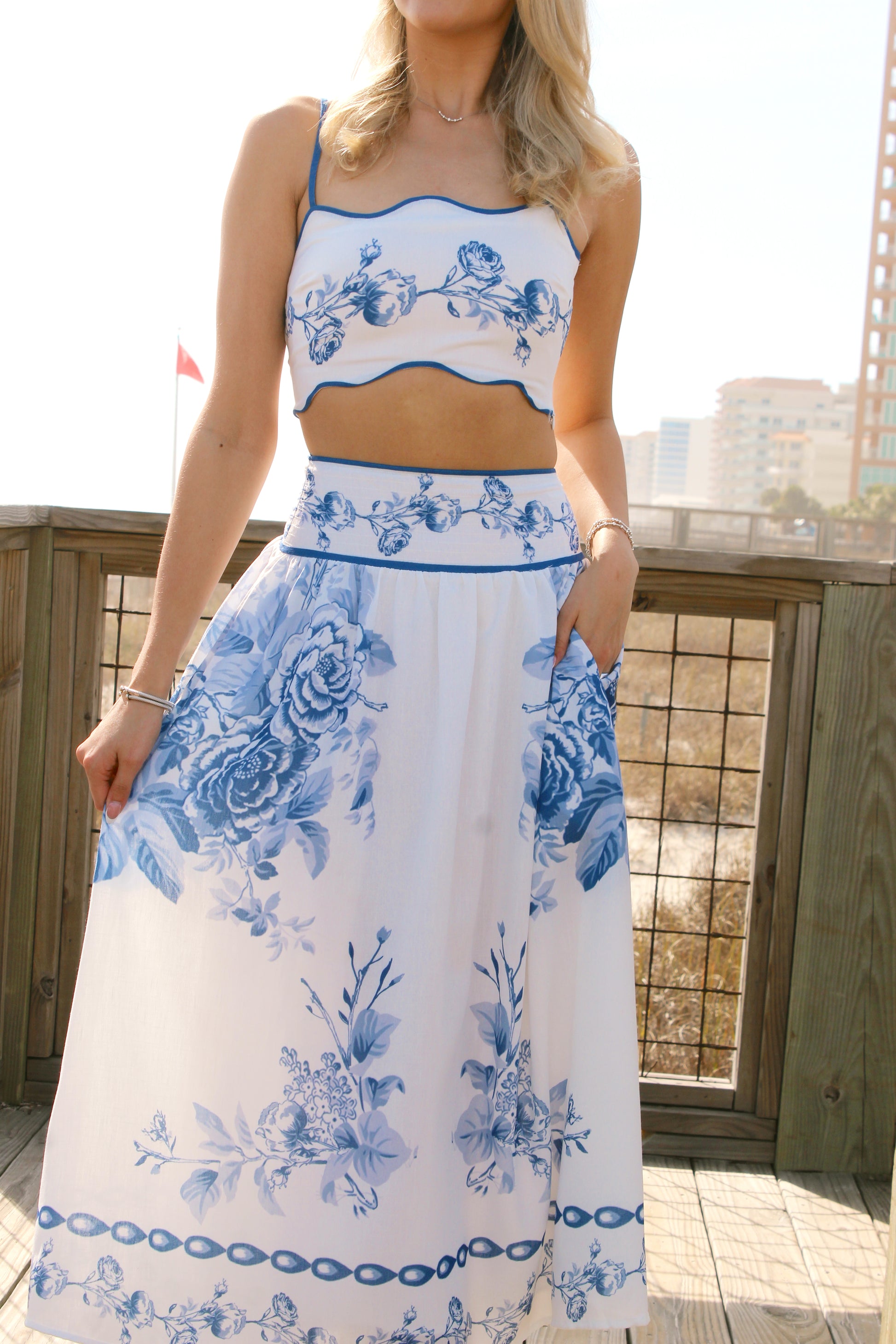 Elegant with a coastal charm. This blue and white floral two-piece set features a dainty cropped top with delicate straps and scalloped trim detailing, paired with a flowy high-waisted midi skirt for the most flattering, feminine silhouette. The soft toile-inspired print adds a timeless, romantic feel that’s perfect for beach events, brunch dates, or summer getaways. Designed with a hidden side zipper in both the top and skirt for a secure, seamless fit.